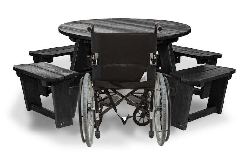The Brimham picnic table (pictured above) can be adapted for one or two wheelchair spaces. Its ‘walkthrough’ configuration is helpful too for those who can’t easily lift their leg over the seat to get in.