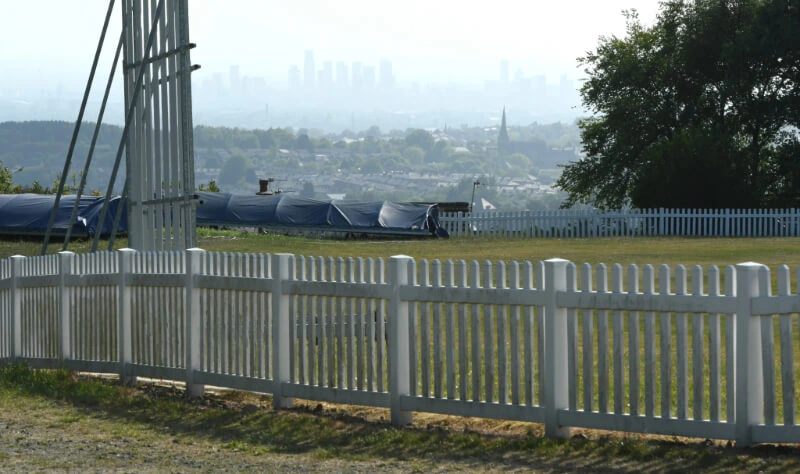 Away to the south, with the land falling away, precipitously, from a white picket fence surrounding the cricket pitch, Hartshead Pike Tower is prominent.