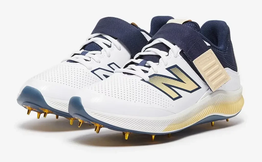 Bowling cricket shoes usually have a front velcro strap that helps to lock each foot in place – like the New Balance CK4040 – (see photo above) available in white/navy/gold – like the gold studs!