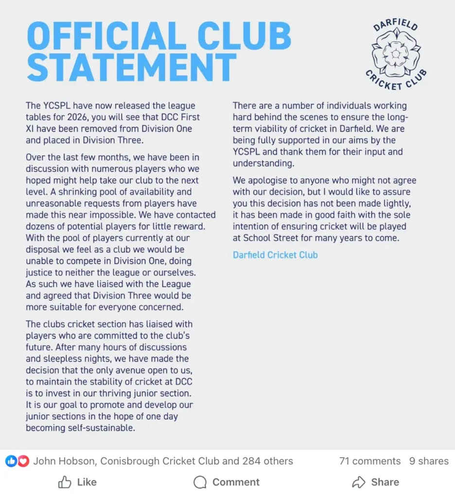 Darfield Cricket Club of the Yorkshire Cricket Southern Premier League (YCSPL) are the latest club to assess their squad strength and future direction. Their first team have swapped Division One for Division Three for the 2026 season and pulled no punches in a club statement from 1 November.