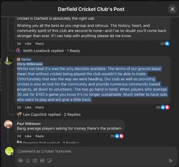 Reaction on Facebook has been sympathetic with plenty of views around paying cricketers at grassroots.
