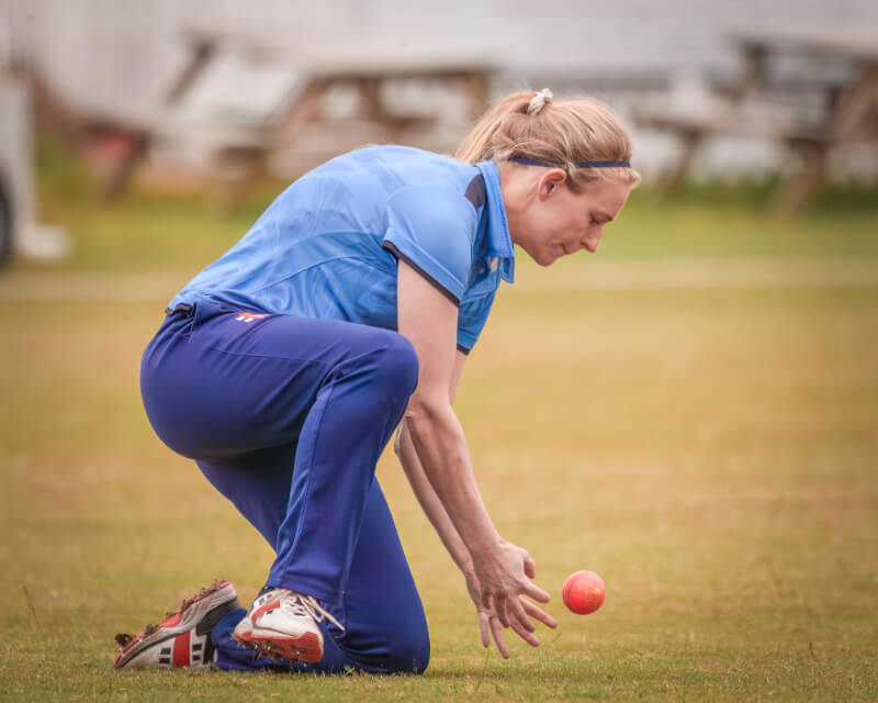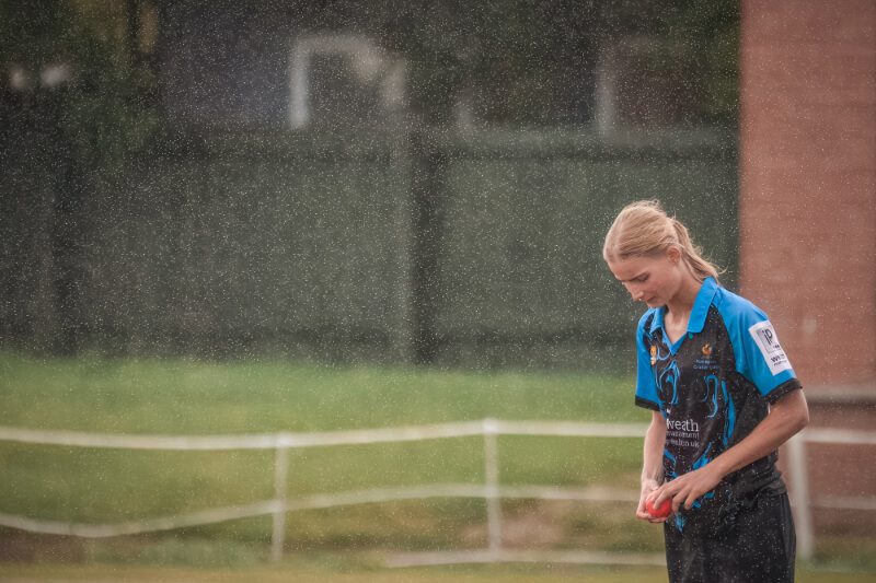 By now, any lighter clouds near the ground had disappeared and the first spots of rain that would surely signify a rain delay were starting to fall. At the beginning of the 16th over, the vital wicket of Kelly Jenkins was taken as she was clean bowled by Immy Hartley.