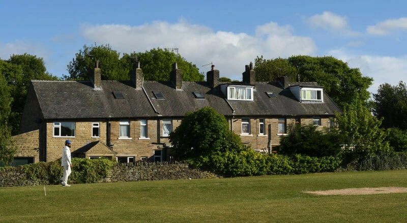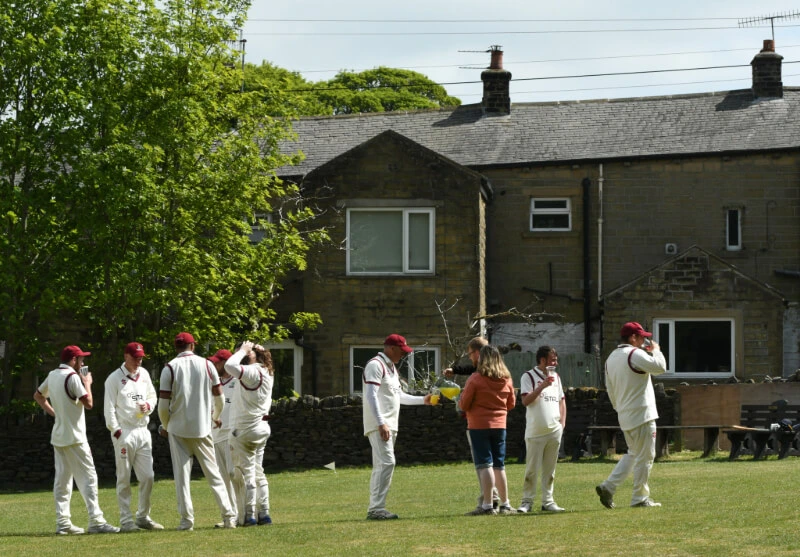 Lovely to see a gritstone wall – signature of the South Pennines – separating the cricketers from the homes of Roydwood Terrace. Good walls make good neighbours?